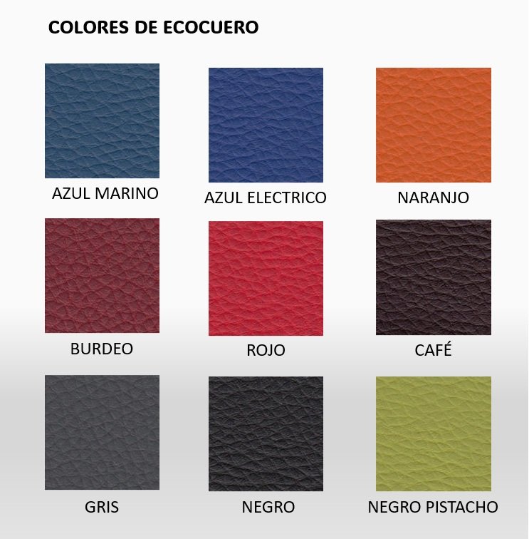 Los asientos y respaldo tapizado en Tela Lana o Ecocuero destacan por su ergonomía, fácil limpieza y alta durabilidad, mientras que los patines regulables en altura aseguran una mayor estabilidad en superficies irregulares.