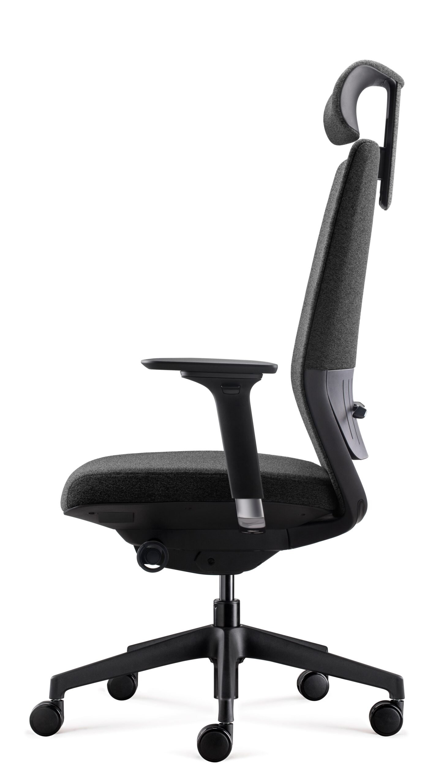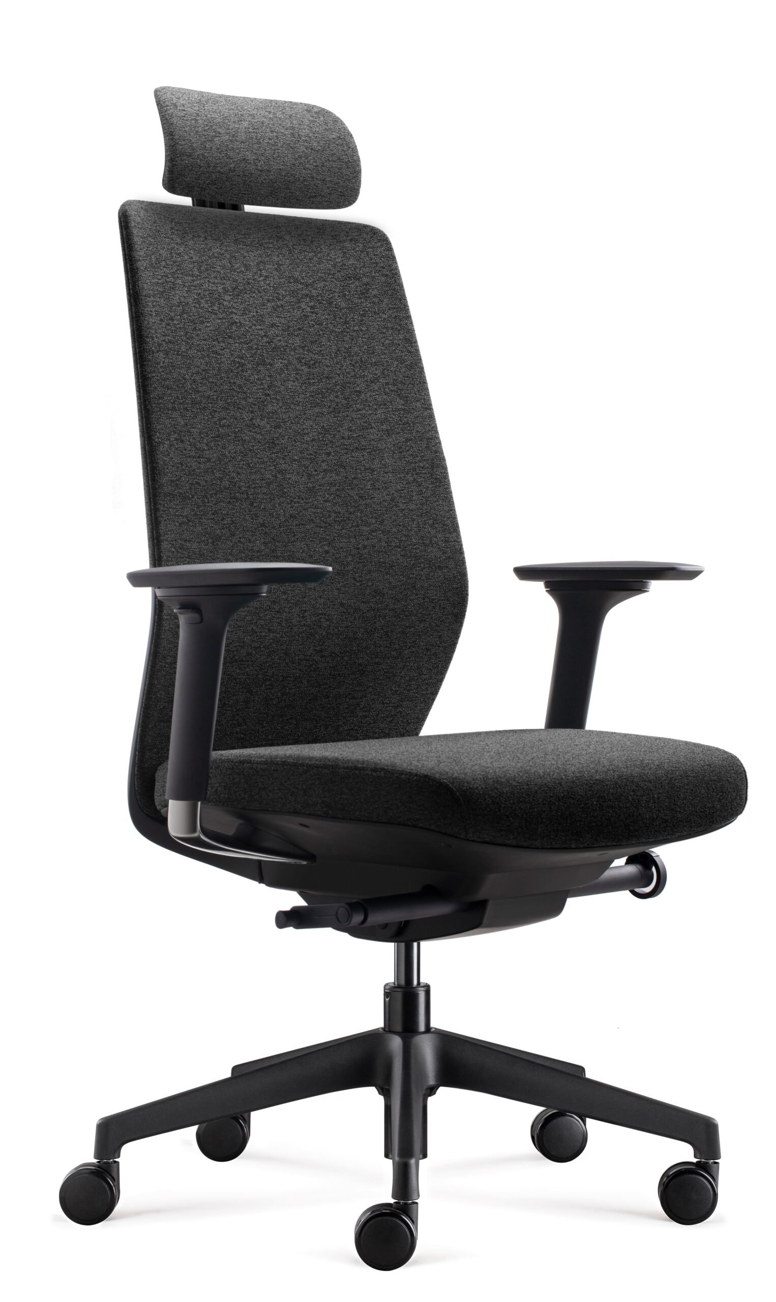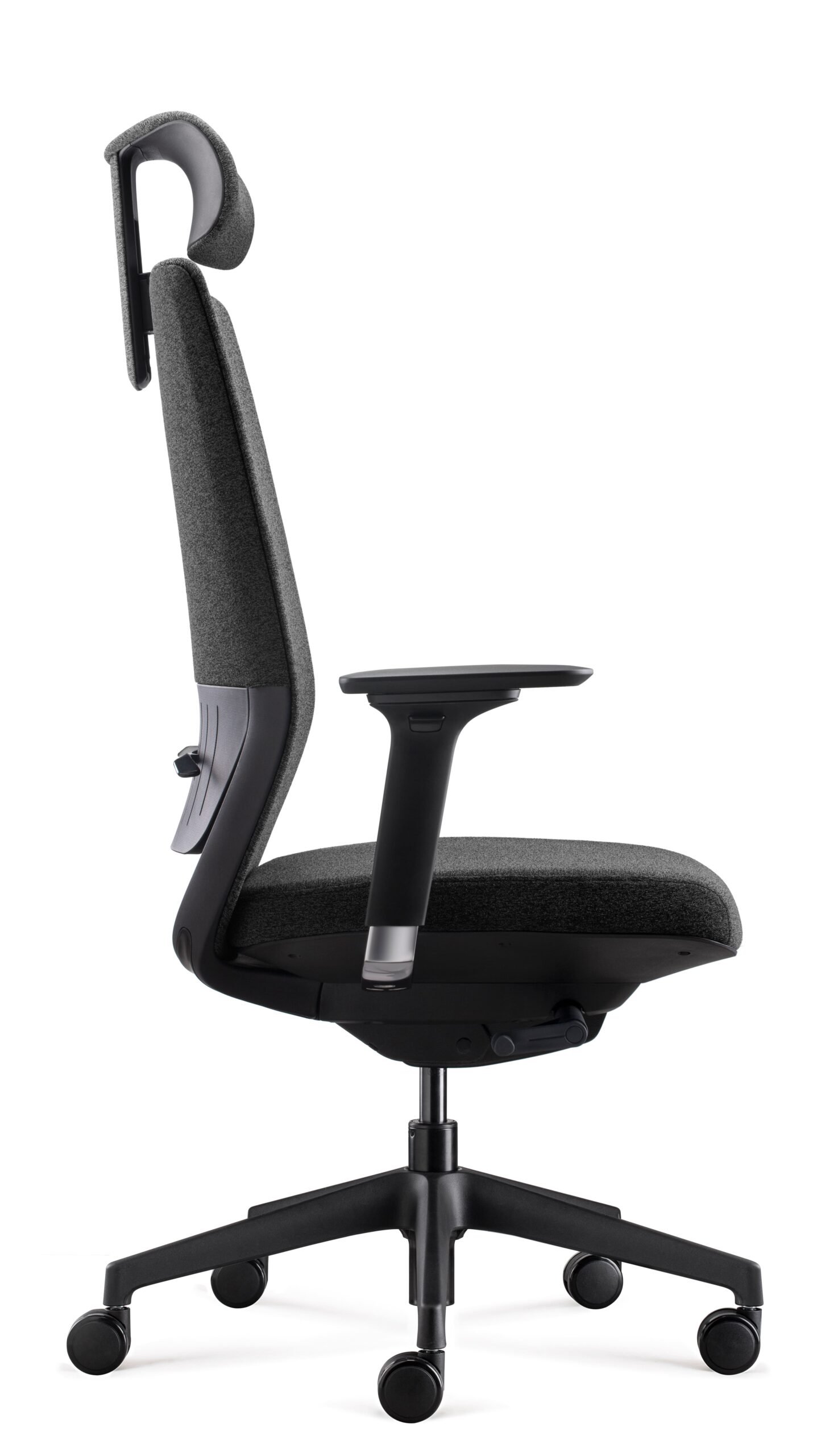 El apoyacabezas regulable en altura, también de espuma inyectada, complementa la ergonomía total del asiento, mientras los apoyabrazos de aluminio pulido y PU se ajustan en altura, profundidad y ancho para adaptarse a cualquier postura.