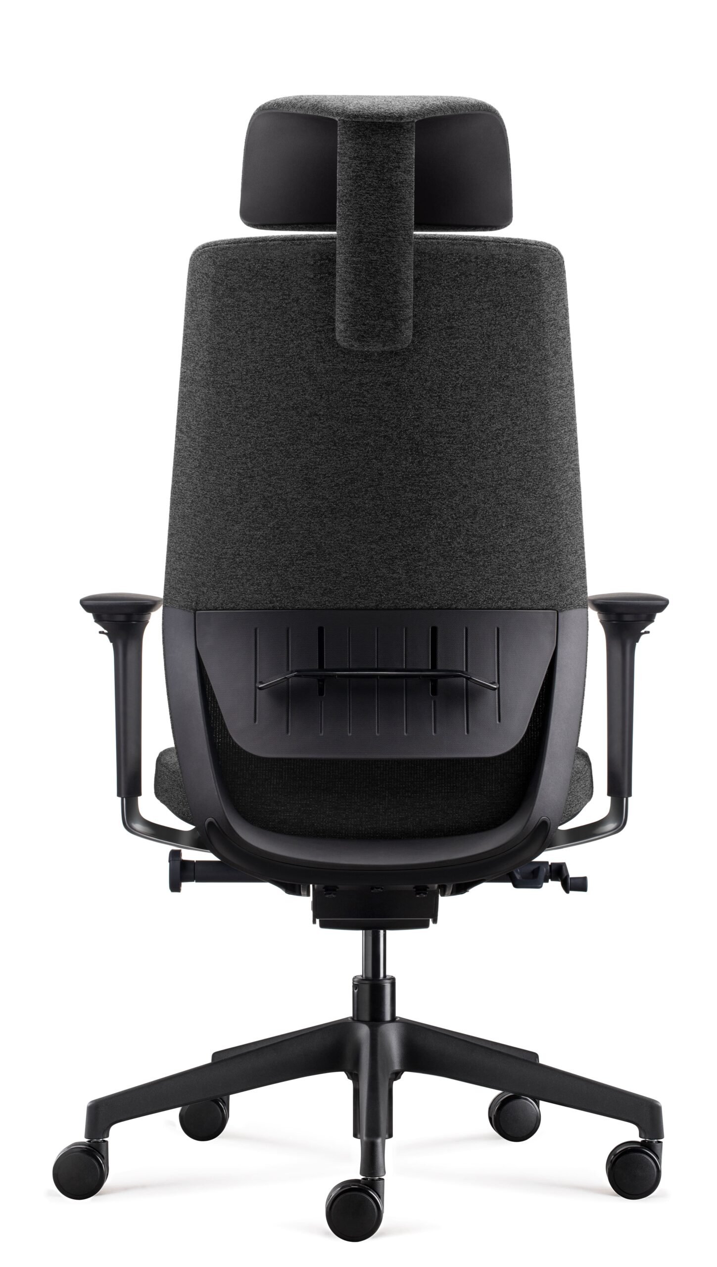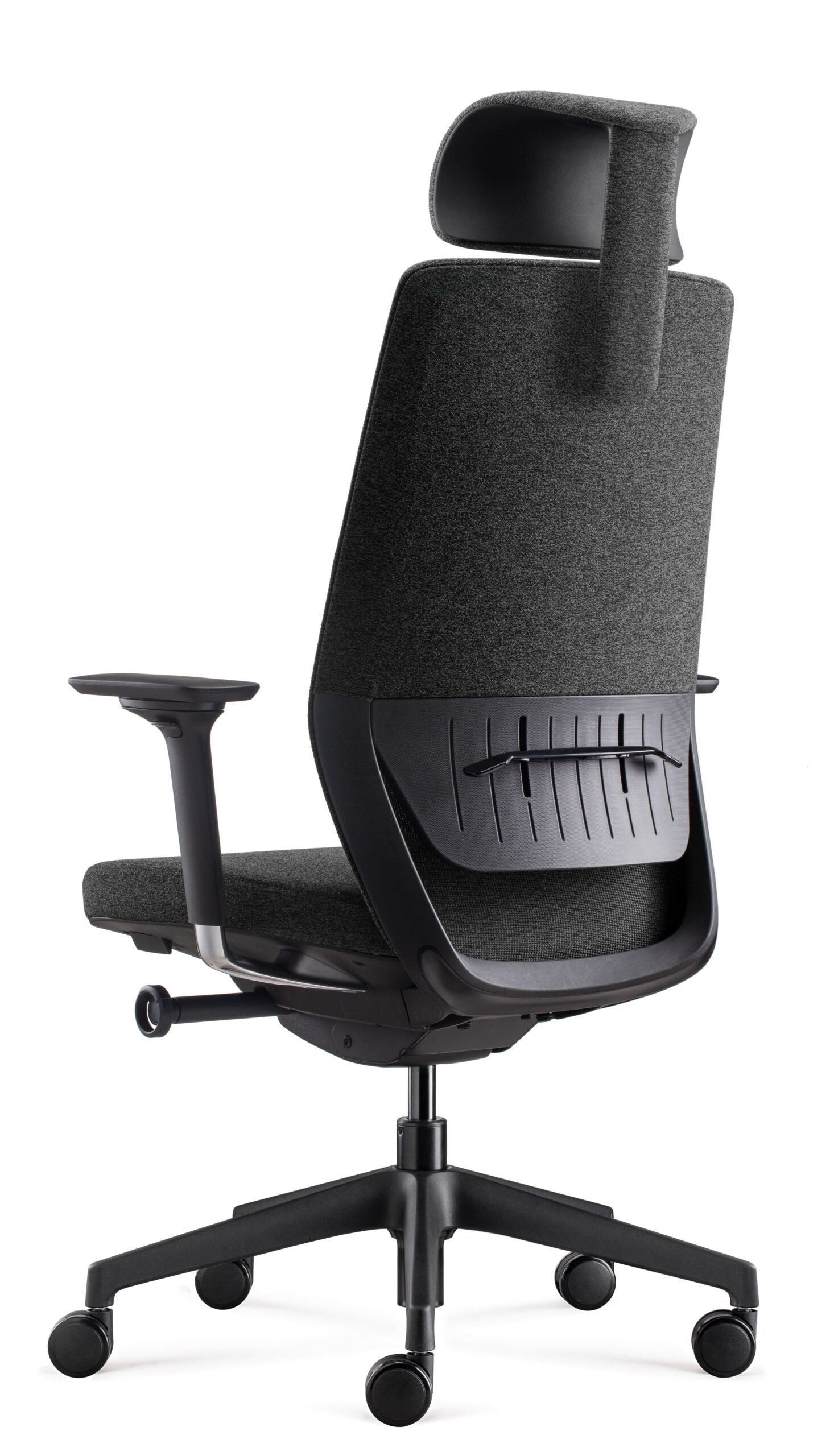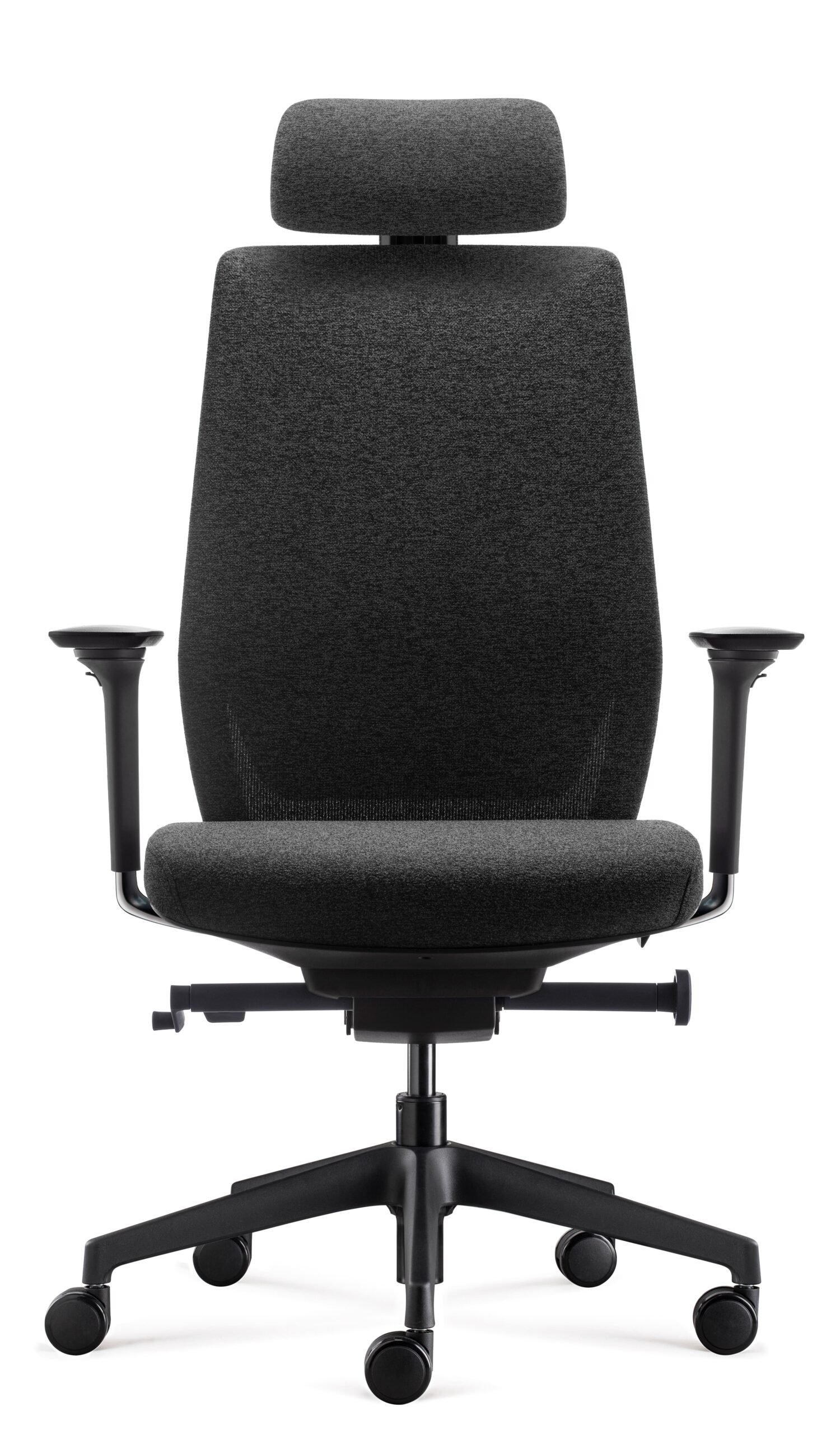 El apoyacabezas regulable en altura, también de espuma inyectada, complementa la ergonomía total del asiento, mientras los apoyabrazos de aluminio pulido y PU se ajustan en altura, profundidad y ancho para adaptarse a cualquier postura.